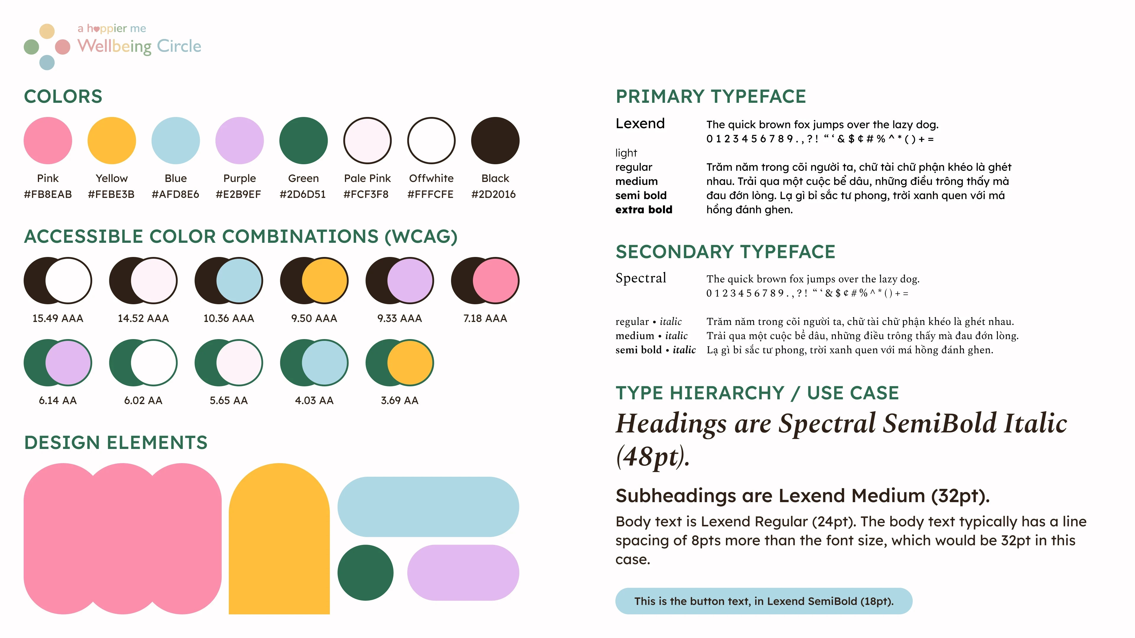 Wellbeing Circle’s visual style features vibrant colors, reader-friendly typefaces like Lexend and Spectral, and playful, round design elements — all a bit distinct from Happier Me’s branding. These changes reflect Happier Me’s desire to define this project as separate and our concerns about the accessibility of the previous pastel color palette. To capture these changes and give the resources necessary for Happier Me to maintain consistency after hand-off, I created a simple style guide, shown below.
