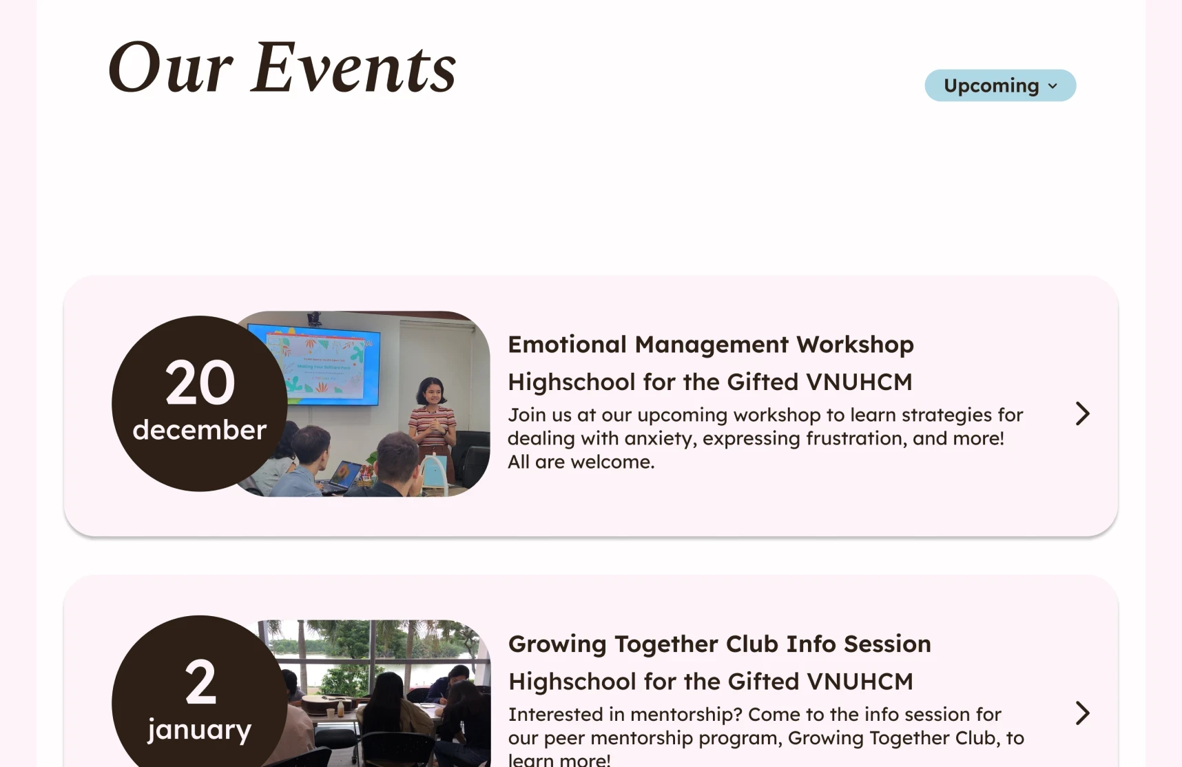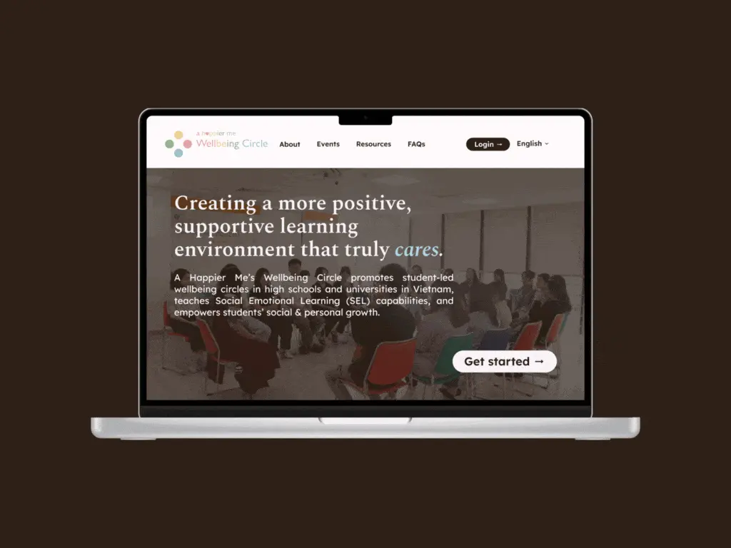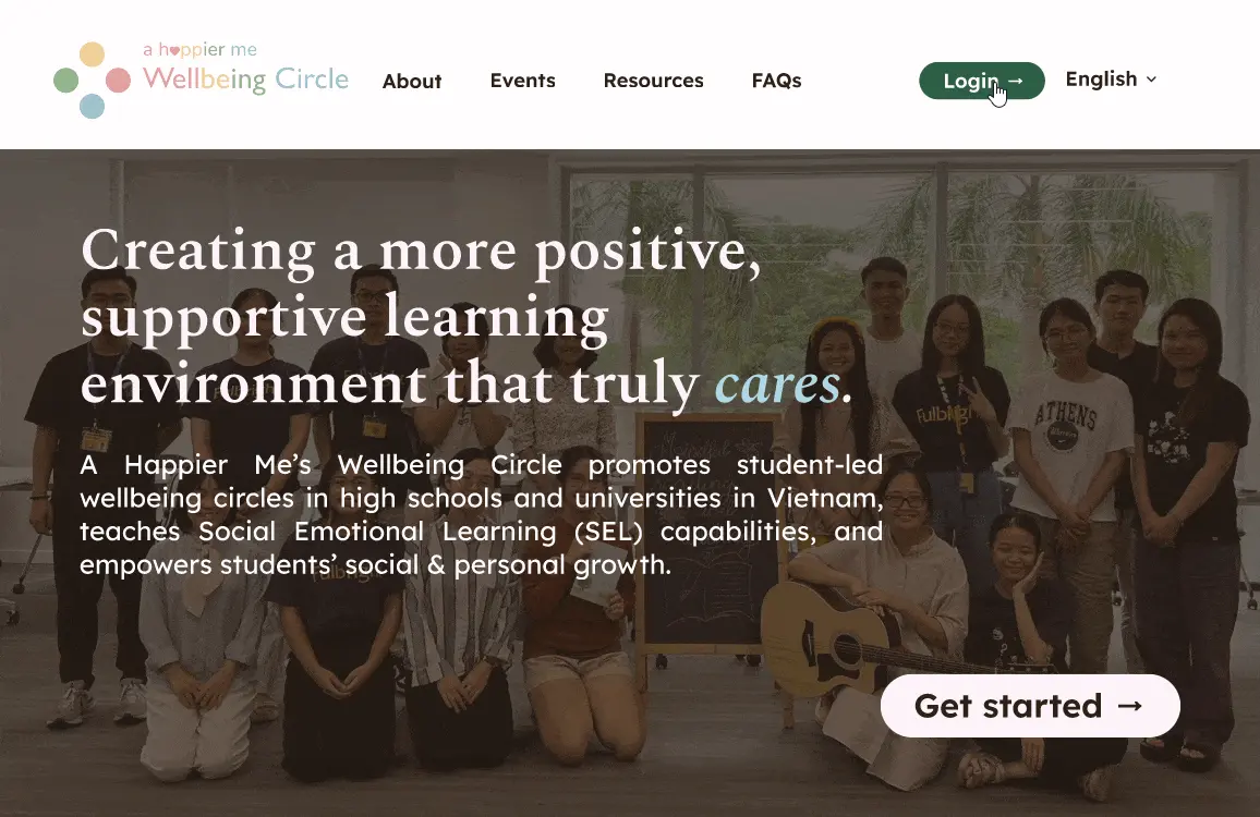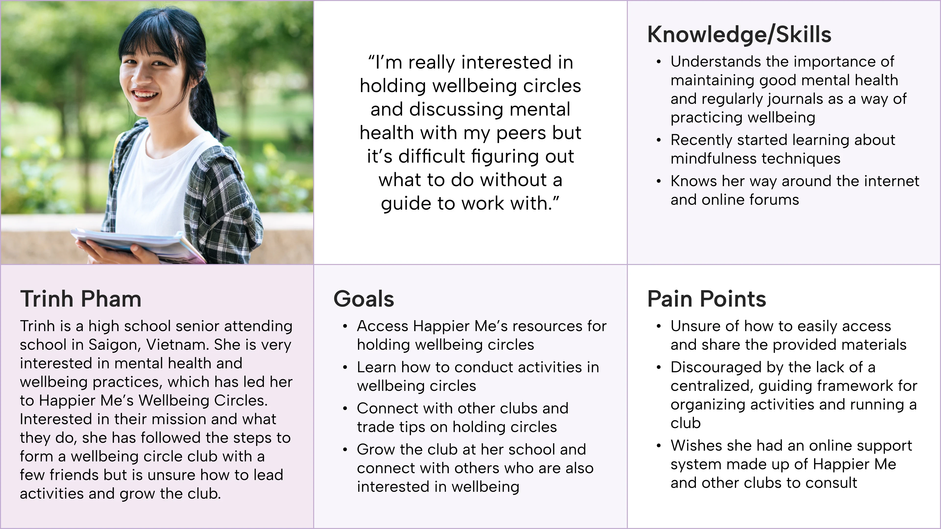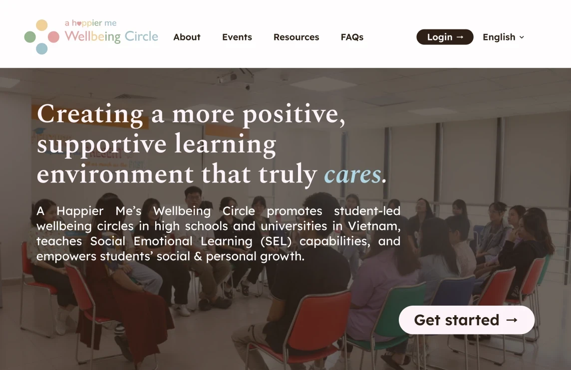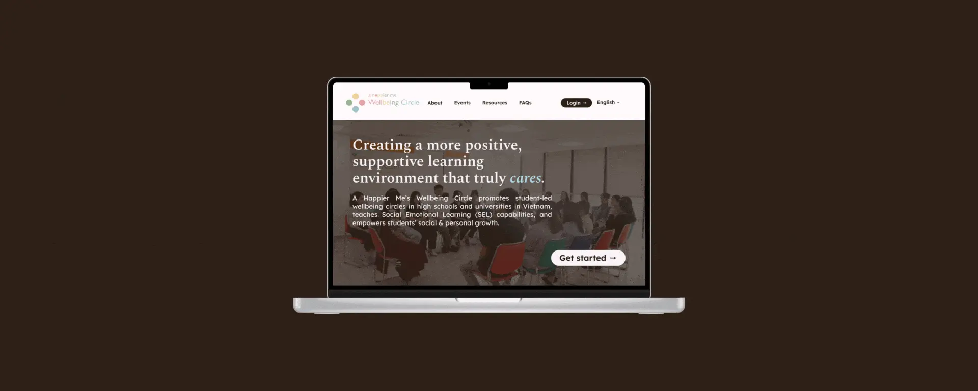 Happier Me is a social enterprise that collaborates with Vietnamese public high schools and universities to support students' wellbeing and mental health. Their latest project, Wellbeing Circle, seeks to raise awareness about social-emotional health, promote positive habits that increase student wellbeing, and teach valuable mental health practices to better the lives of Vietnamese youth. However, due to limited volunteers and busy personnel, they lacked the resources to design and launch the Wellbeing Circles platform.