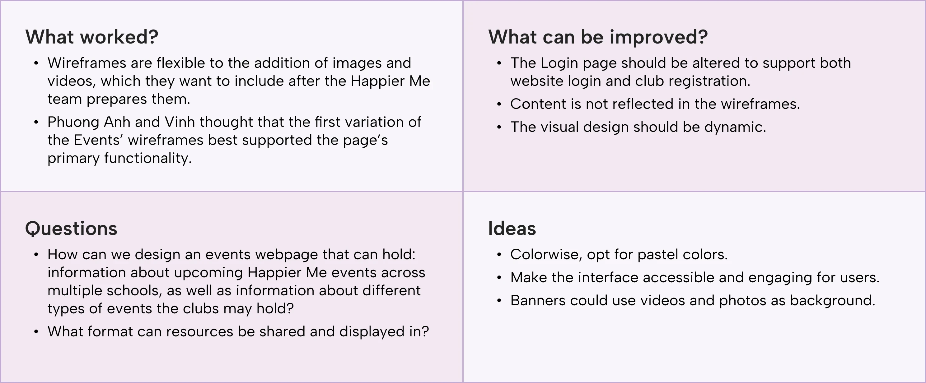 The feedback we gained from Phuong Anh & Vinh, organized in a capture grid form.