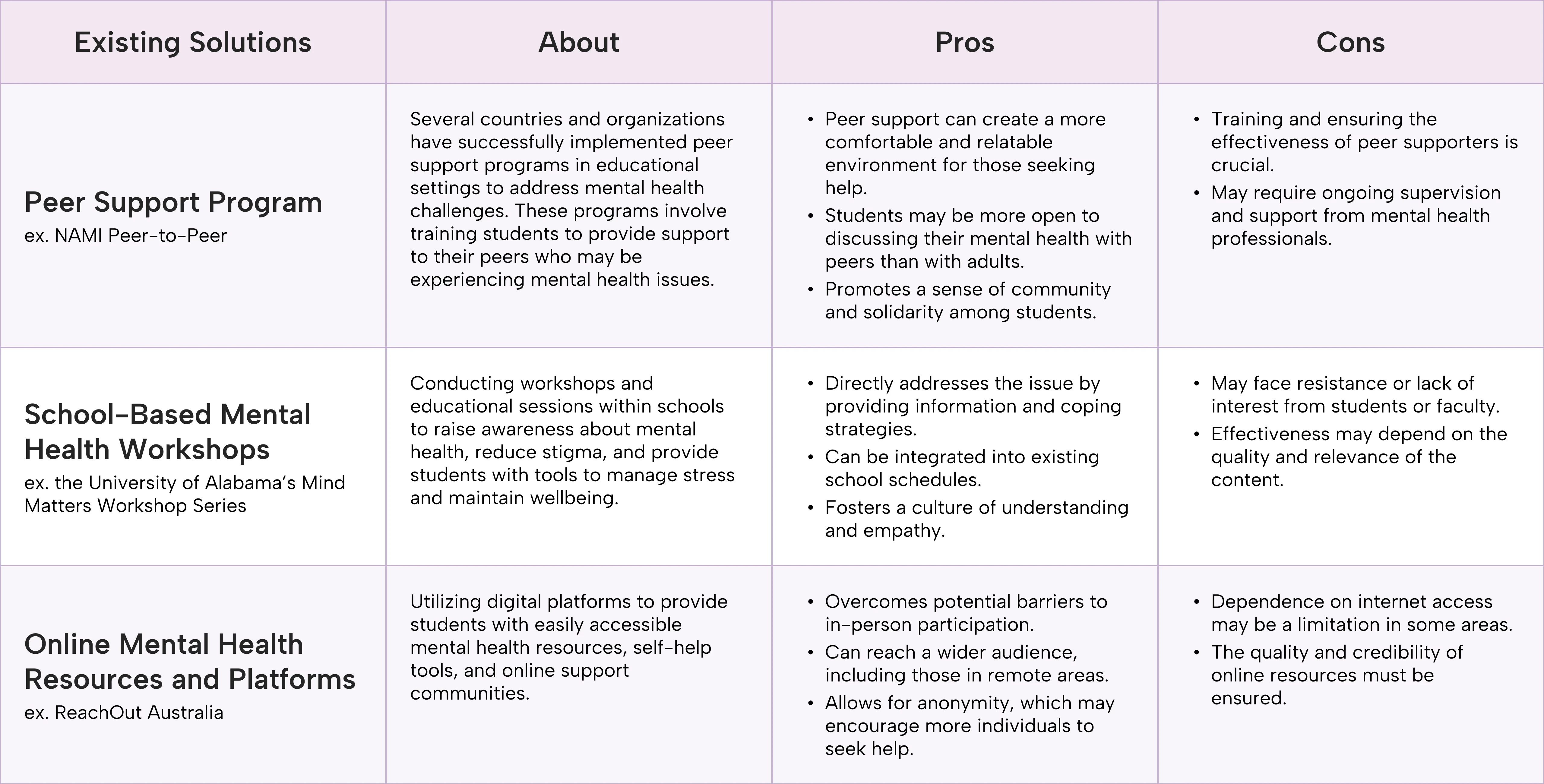 Our existing solutions analysis, focused on programs similar to Wellbeing Circle: peer support programs, school-based mental health workshops, and online mental health resources and platforms.