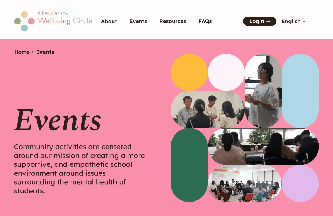 Going off Happier Me’s suggested sitemap and required functions for Wellbeing Circle, we quickly created wireframes for the website’s main pages. The layouts of the Home, Login/Sign-up, About, Resources, Events, and FAQ pages were kept simple to accommodate additional content on Happier Me’s part.