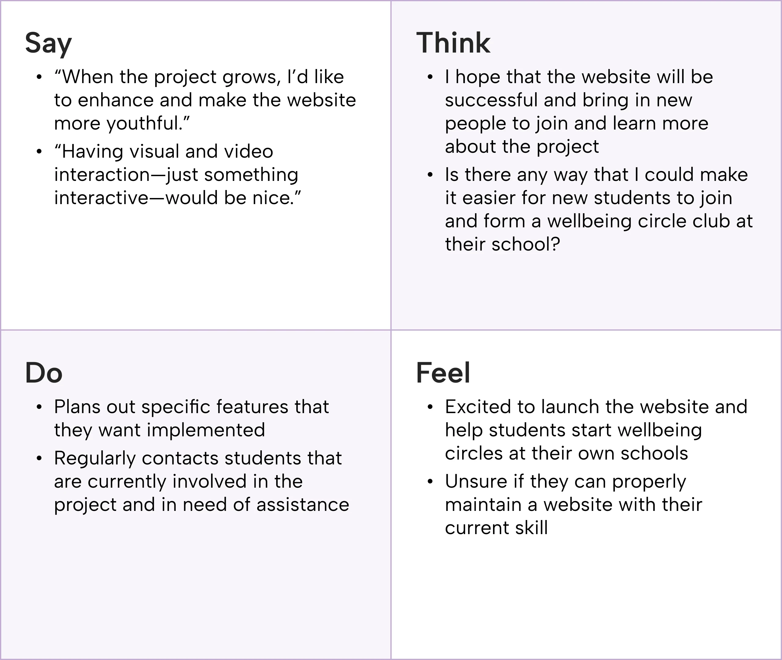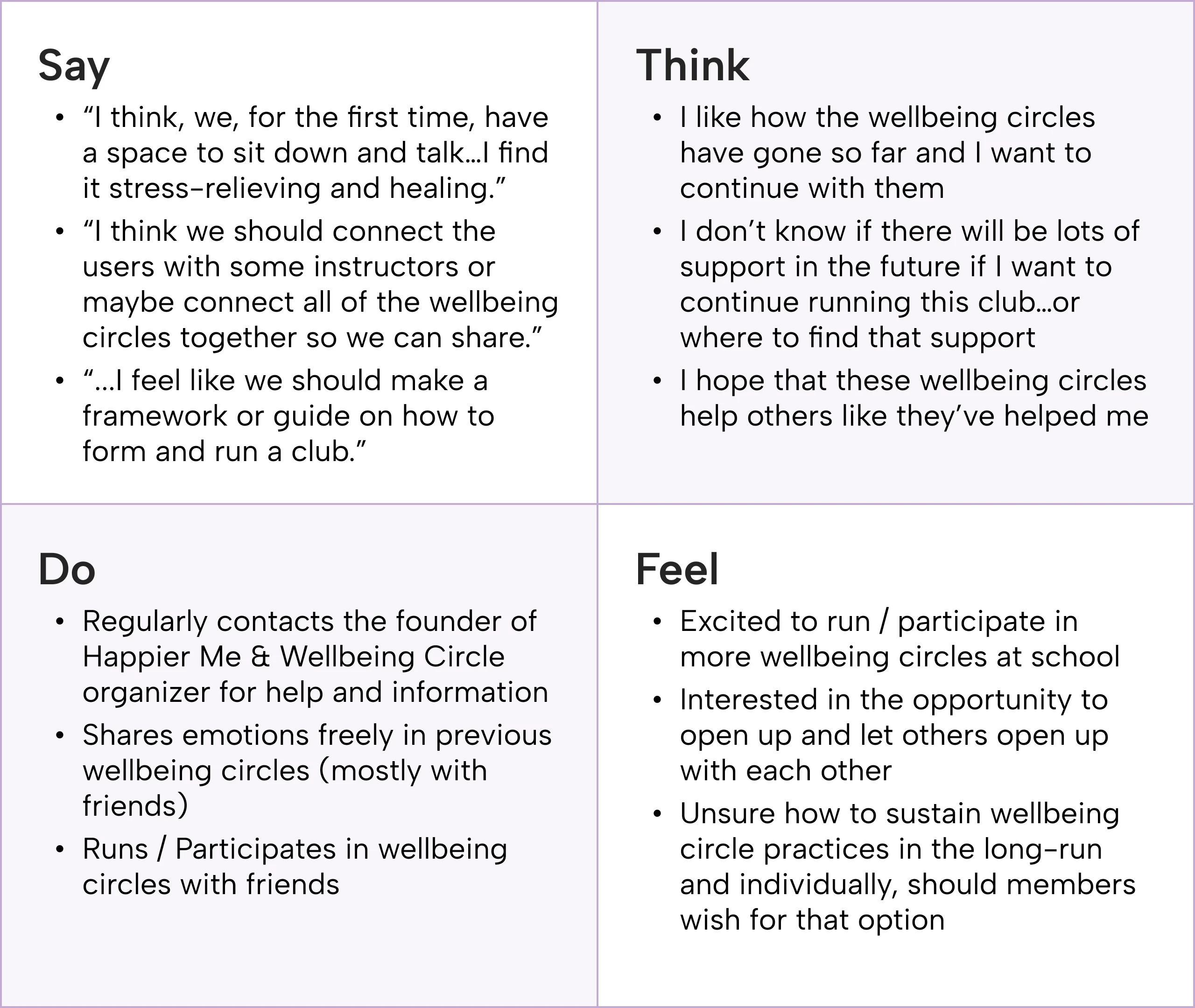 Khoi, on the other hand, represents Happier Me staff that will be running Wellbeing Circle. His empathy map is based off of stakeholder conversations.