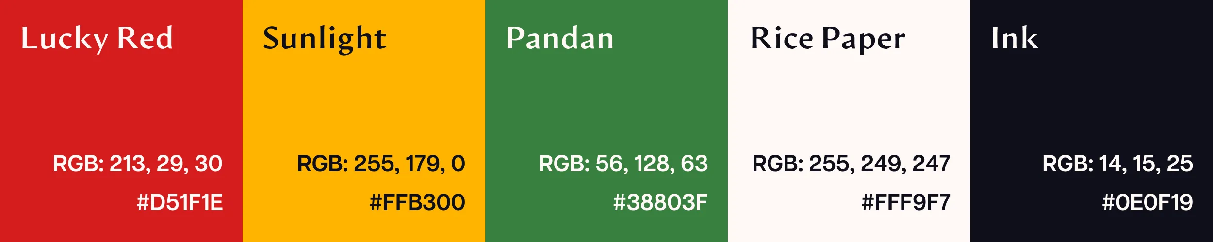 I wanted a warm and bright color palette — colors that matched the tone of Bình Minh Market — so what better primary color than red? Here, red catches your attention and is reminiscent of the auspicious red envelopes with money (lì xì) given to the youth on Lunar New Year. Red also connects back to a sunrise (the English equivalent of bình minh), especially when paired with a bright and happy yellow. The inclusion of green, representative of the farmlands and fresh produce, completes the picture of an early sunrise peeking over an horizon as the sun makes its way up.
