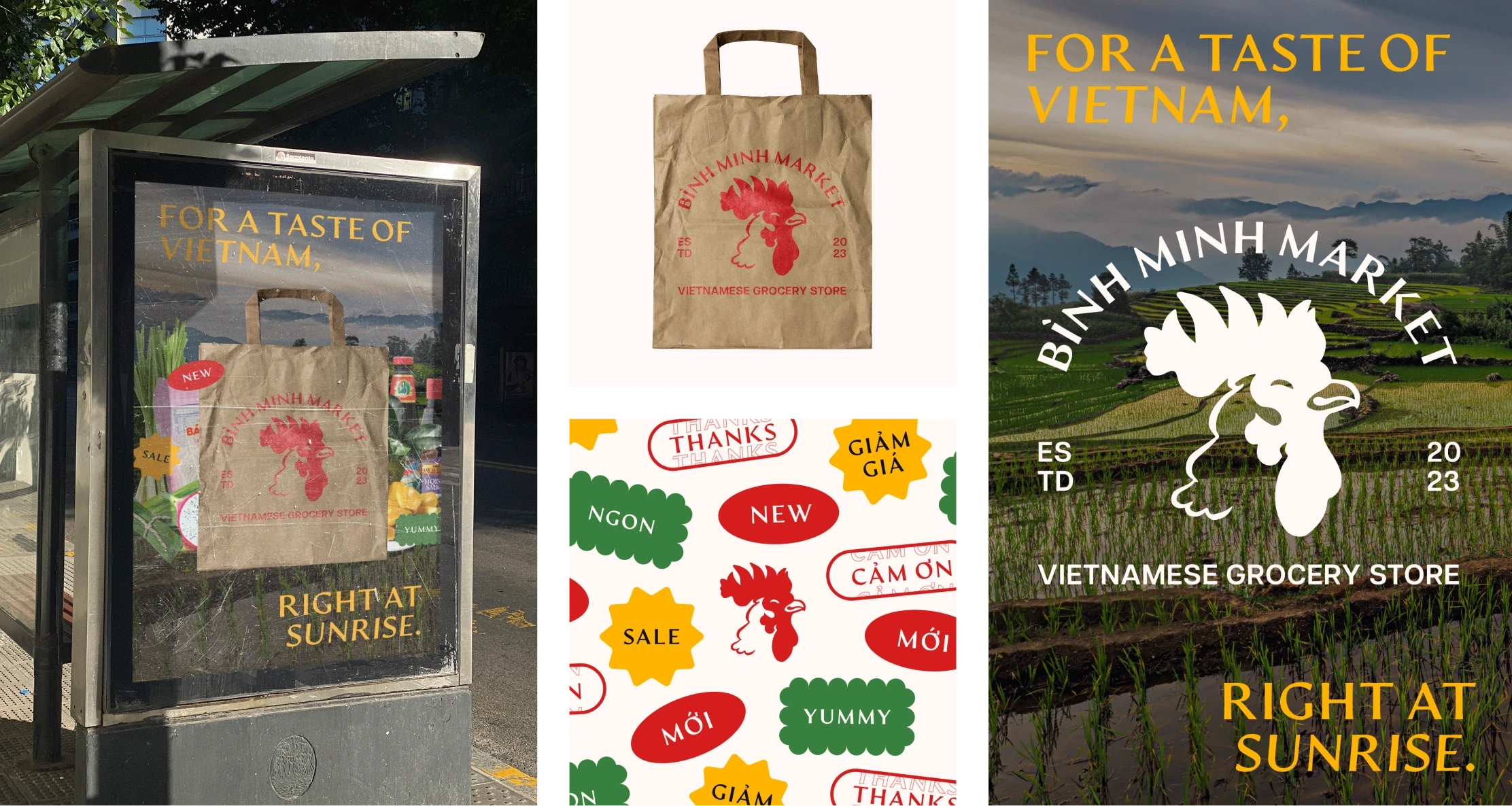 In Vietnamese, bình minh (pronounced bin min) means sunrise. The crowing of a rooster is commonly associated with the coming of the latter, so it made perfect sense to have a rooster as the logo for Bình Minh Market.