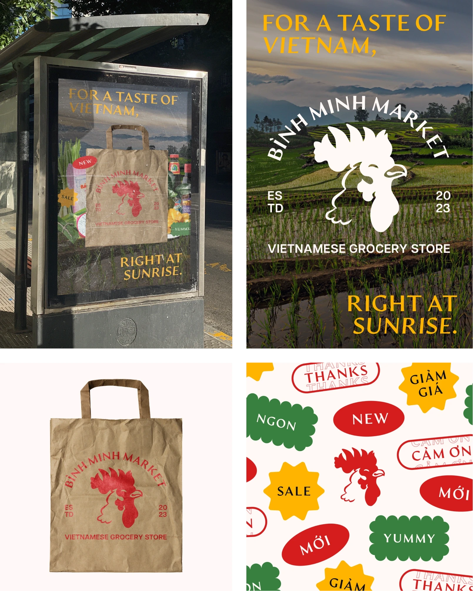 After finalizing the brand identity, I designed a set of stickers for labeling products in-stores and decorating potential graphics and advertisements. Using Photoshop, I also produced a mock-up of Bình Minh Market paper bags, which I doubt a grocery store would lack, and one for an advertisement.