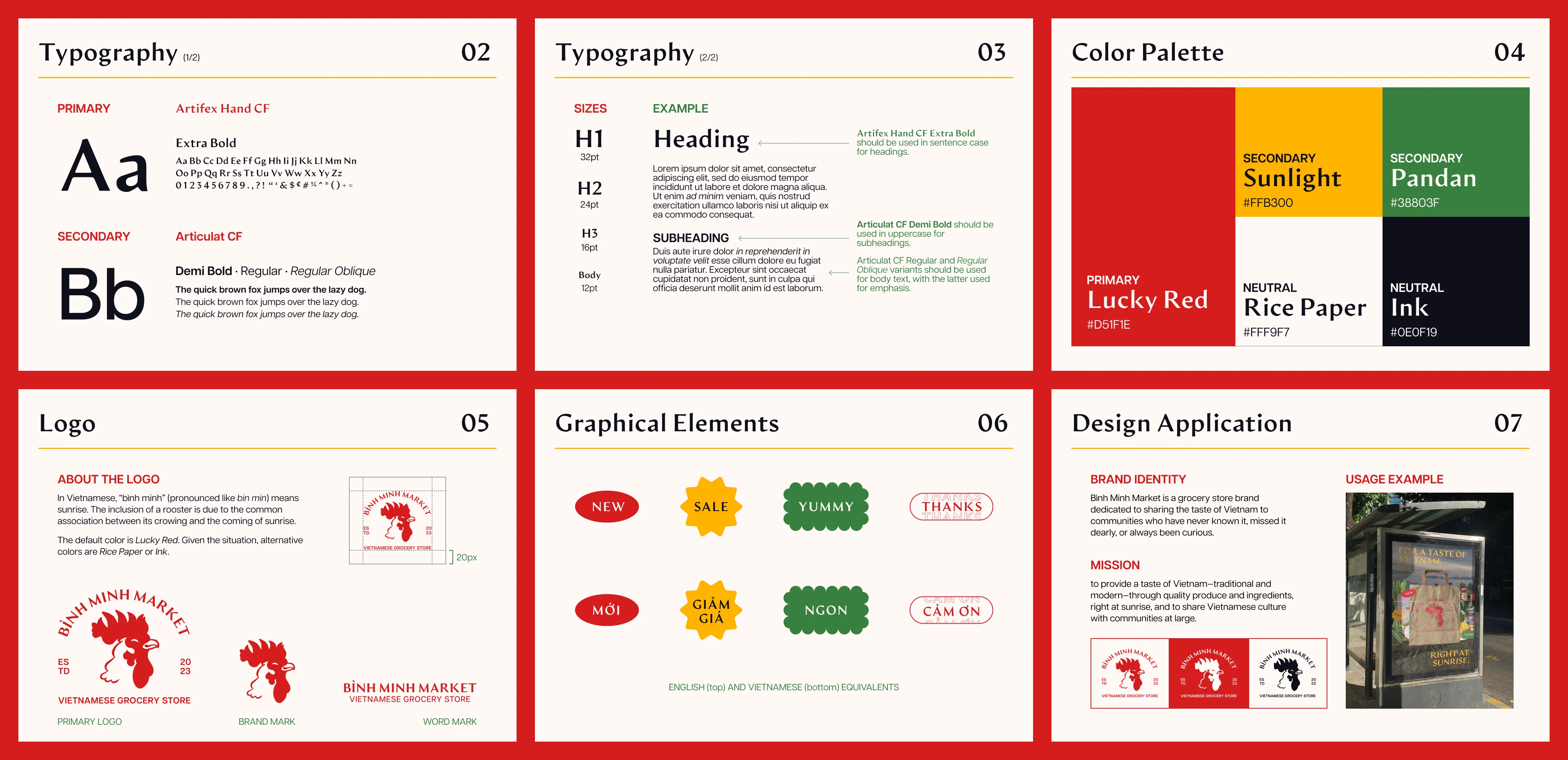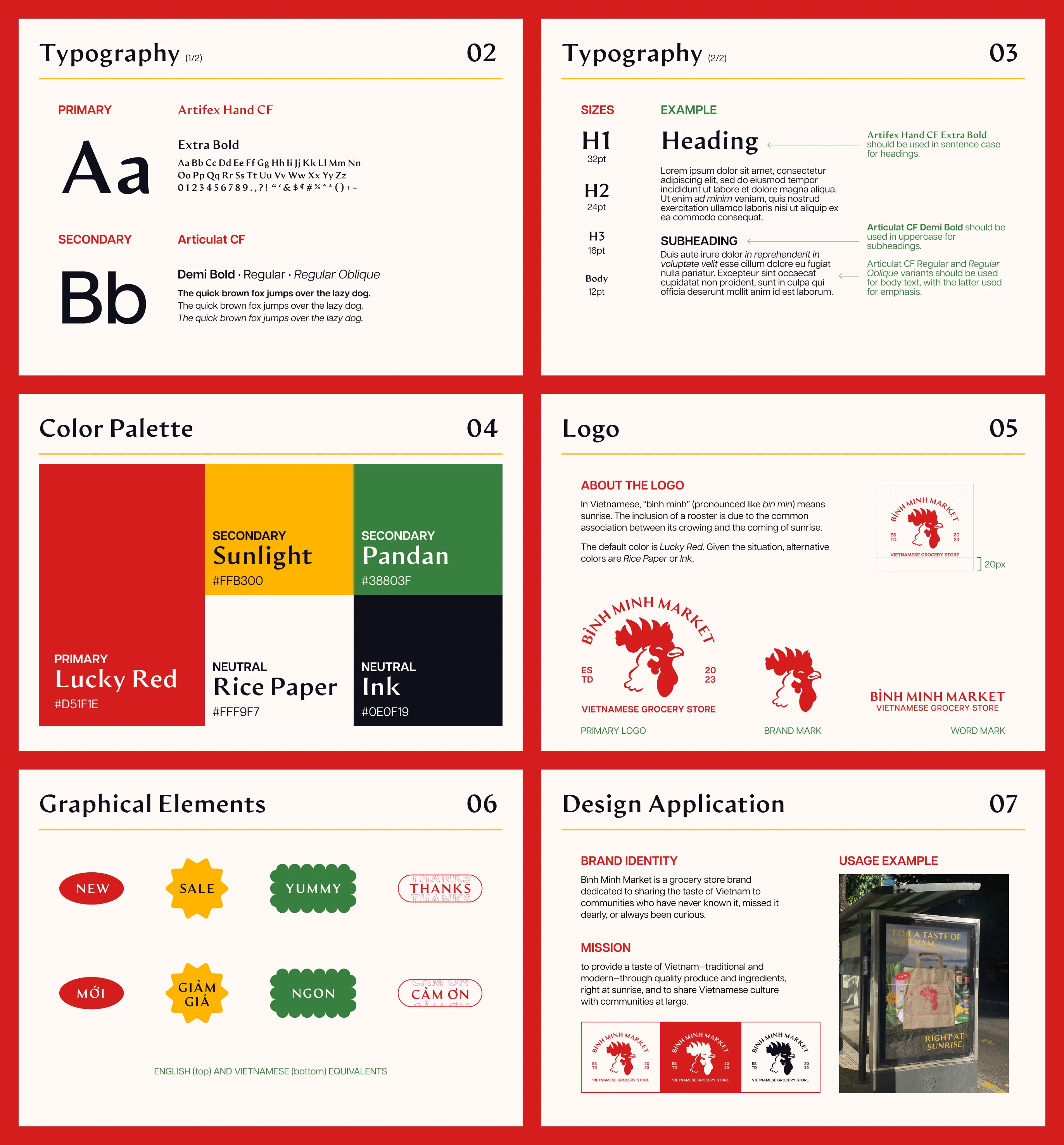 Artifex Hand CF, Bình Minh Market’s primary typeface, is reminiscent of traditional, handwritten styles, while Articulat CF, the secondary typeface, provides round and friendly forms that’s easy to read. Paired together, the two make for a good blend of tradition and modernity that Bình Minh Market offers.