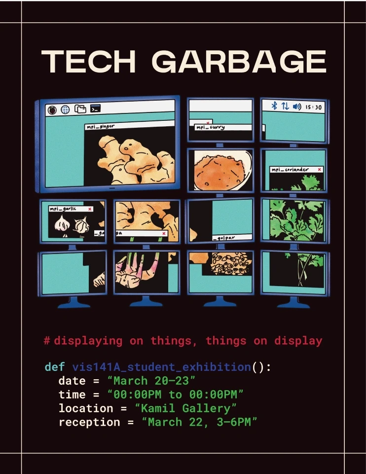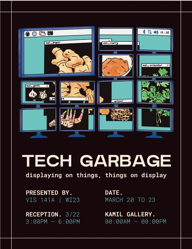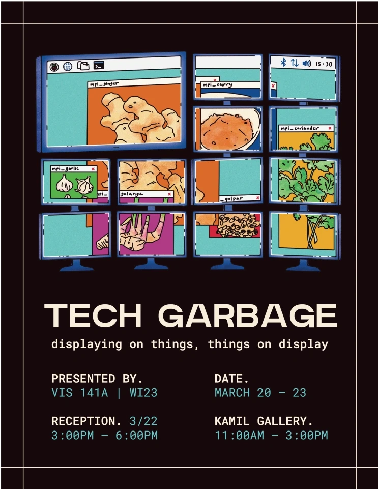 Tech Garbage was an art exhibition that took place from March 20th to March 23rd, 2023 and featured the work of the winter VIS 141A: Computer Programming for the Arts I class at UCSD. These works, ranging from interactive games to animations, were developed across 10 weeks with Python for display on computer clusters — a group of computers working together as a single system — arranged in 2x2 and 1x4 layouts or on other surfaces through the use of multiple projectors.
