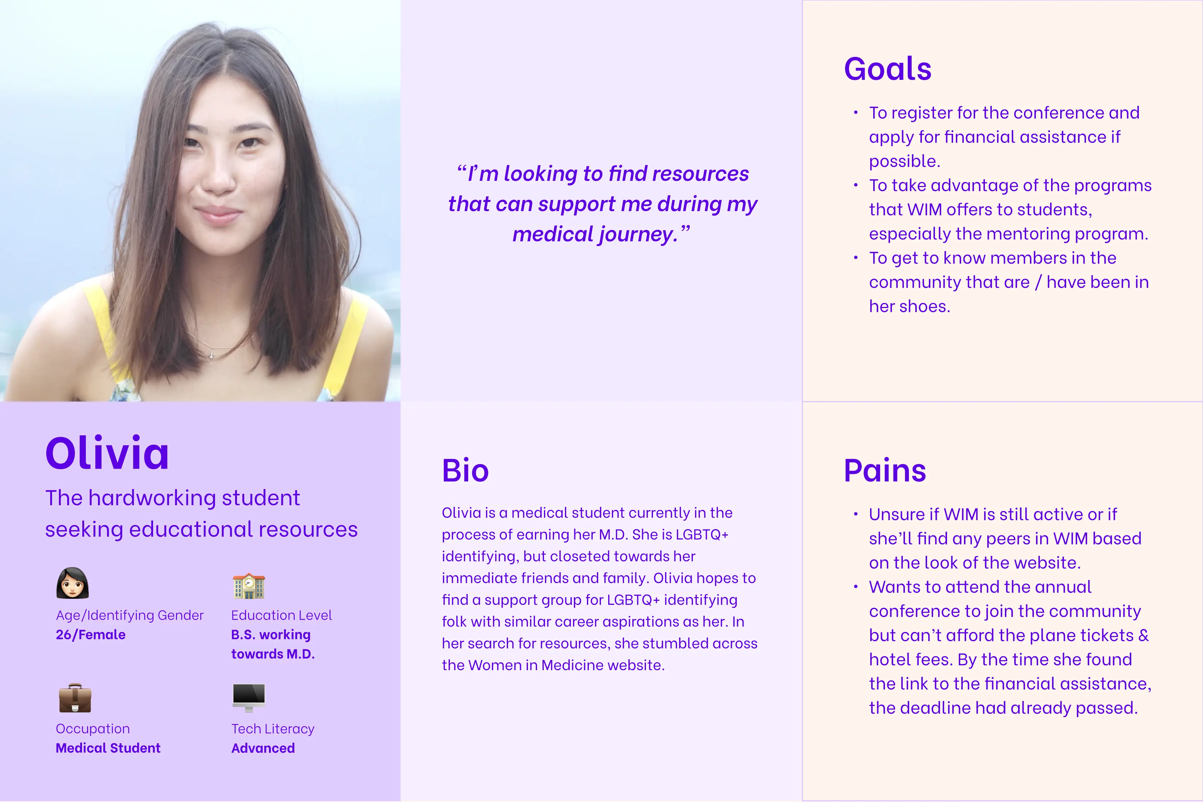 After consolidating information from our surveys and interviews, we developed three user personas: Olivia, Taylor, and Sage. We used these personas to empathize with and understand the pain points and motivations of potential users of WIM’s website.