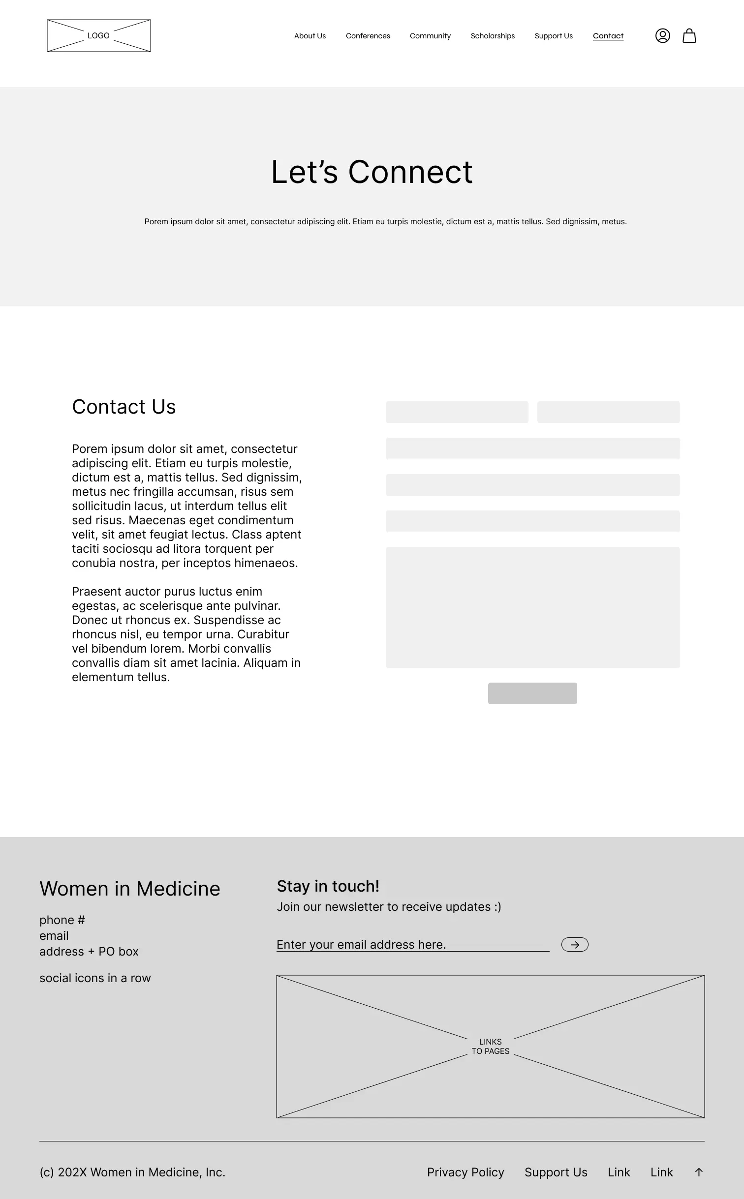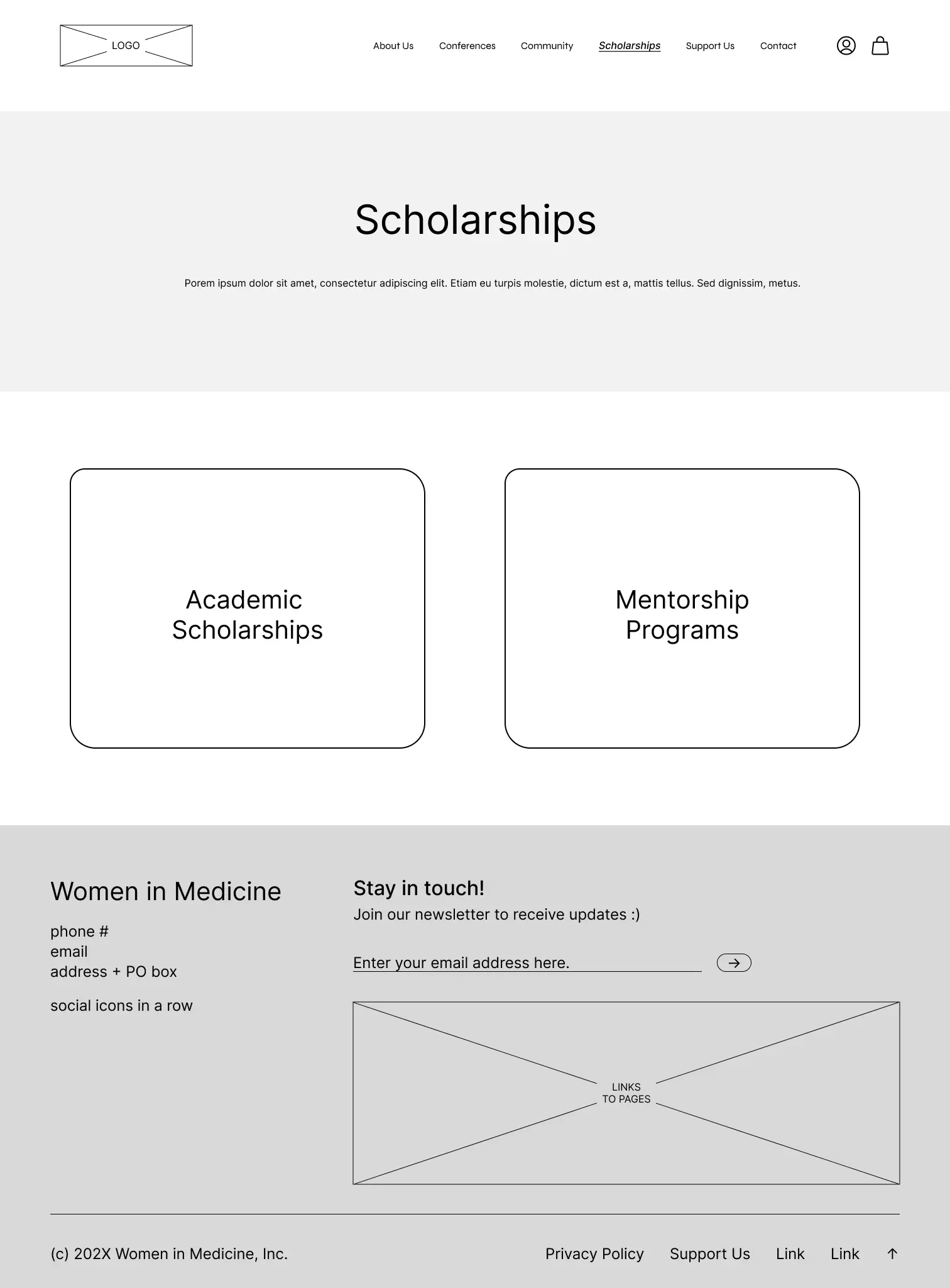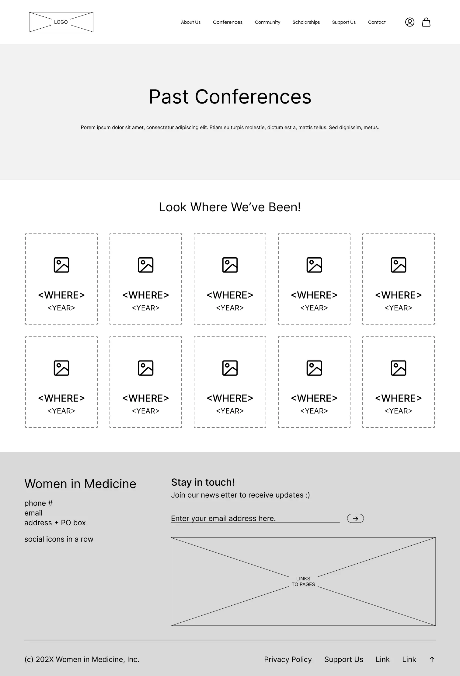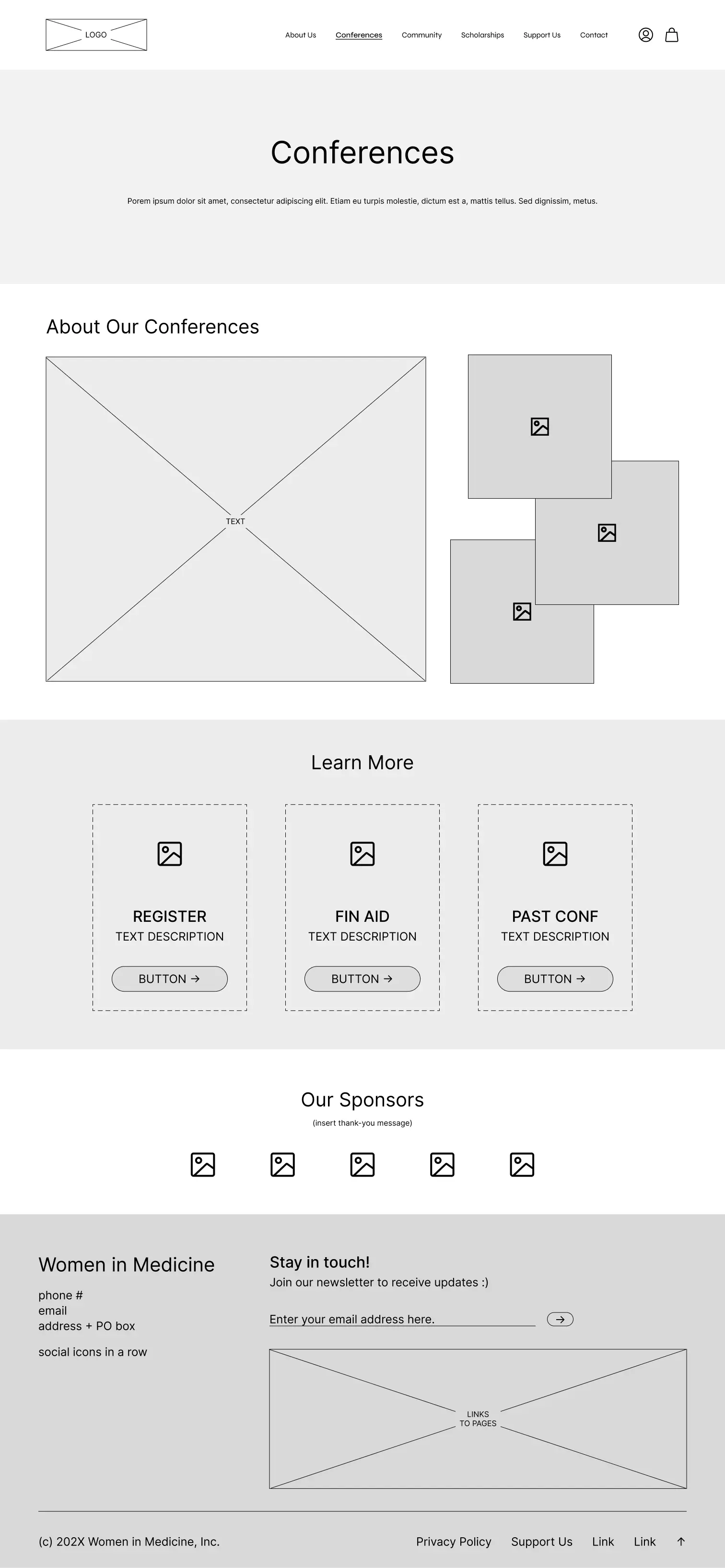 Created wireframes for the navigation bar, footer, and conference pages (Conferences landing, Upcoming Conferences, Financial Assistance, and Past Conferences).