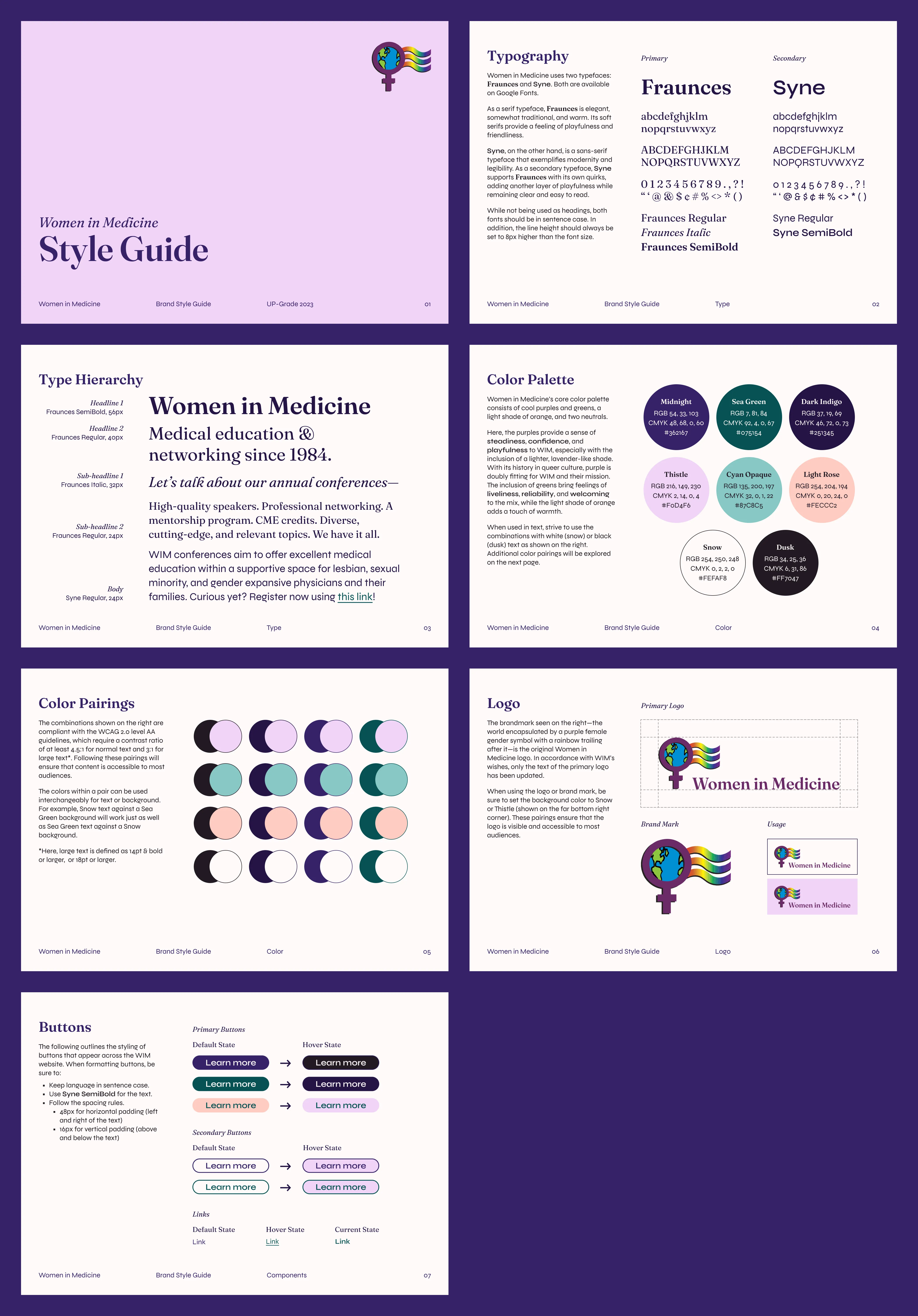 Women in Medicine’s updated core color palette — cool purples and greens paired with a light shade of orange — provide a sense of steadiness, liveliness, and welcoming quite unlike the previous monotonous feel. When paired with the elegant, somewhat traditional Fraunces and the modern, quirky Syne, these feelings of warmth and playfulness are all the more apparent.