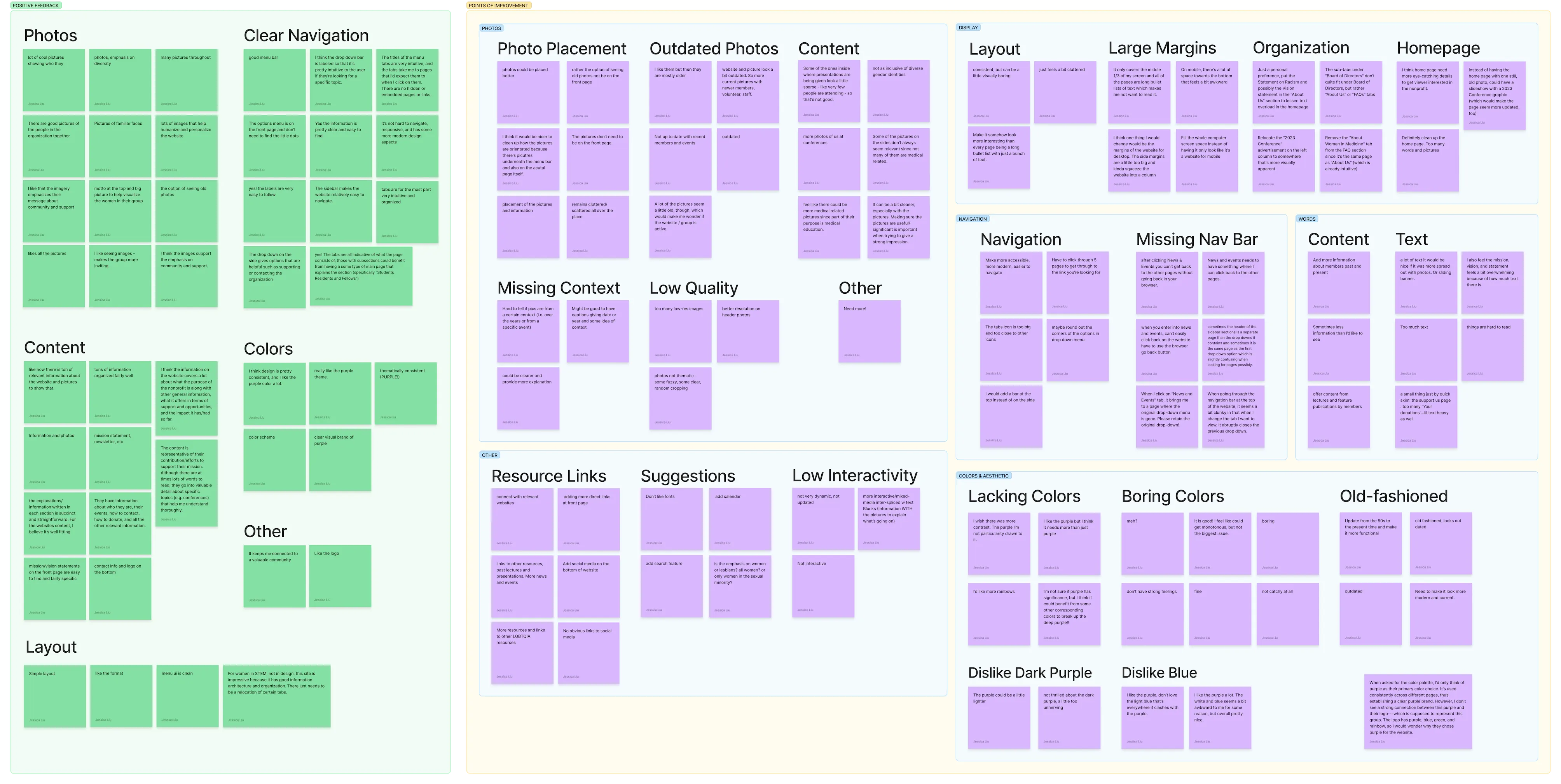 We collected 19 survey responses, 7 of which belonged to WIM members, to assess how current and new users felt about the website’s navigation, content, and aesthetics. From here, we created an affinity map to synthesize our data and organize key findings.